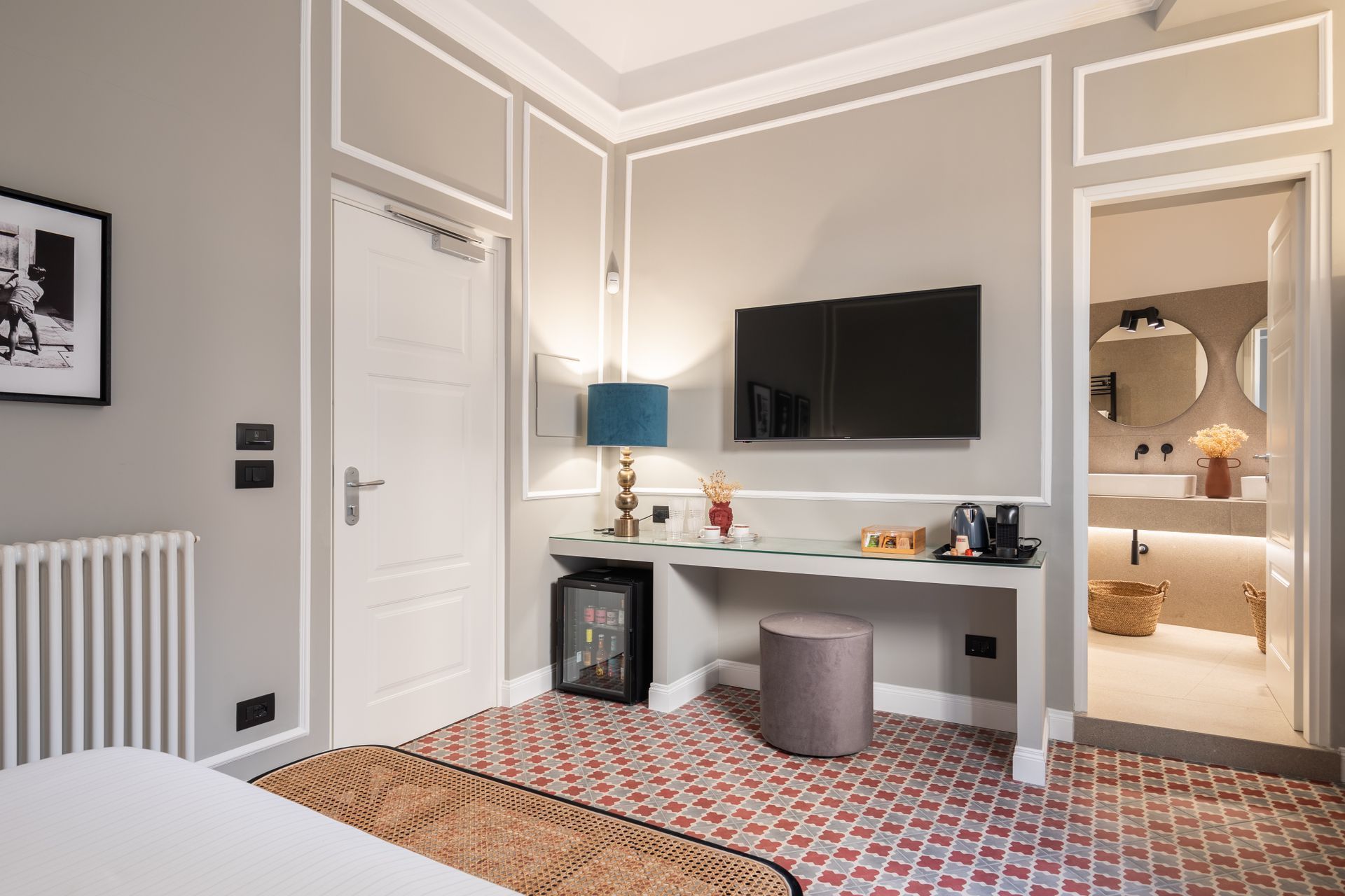 A delightful room inspired by the romantic elopement of two young lovers, unbeknownst to their relatives. 'Fuitìna' in Sicilian dialect means 'short-term elopement' and on the walls is the story of two lovers, being spied upon by a young man, who then runs off to tell his relatives about the secret elopement. The majolica floor tiles and retro armchairs in fine velvet give the room a cosy atmosphere.