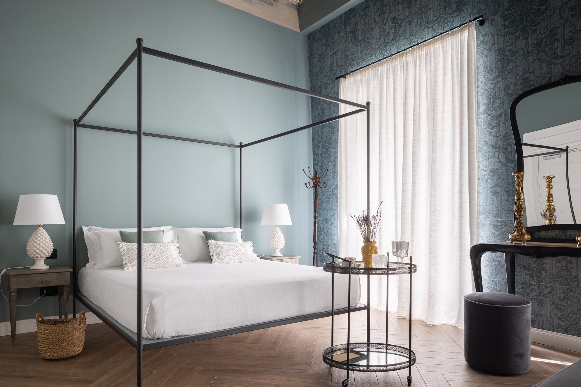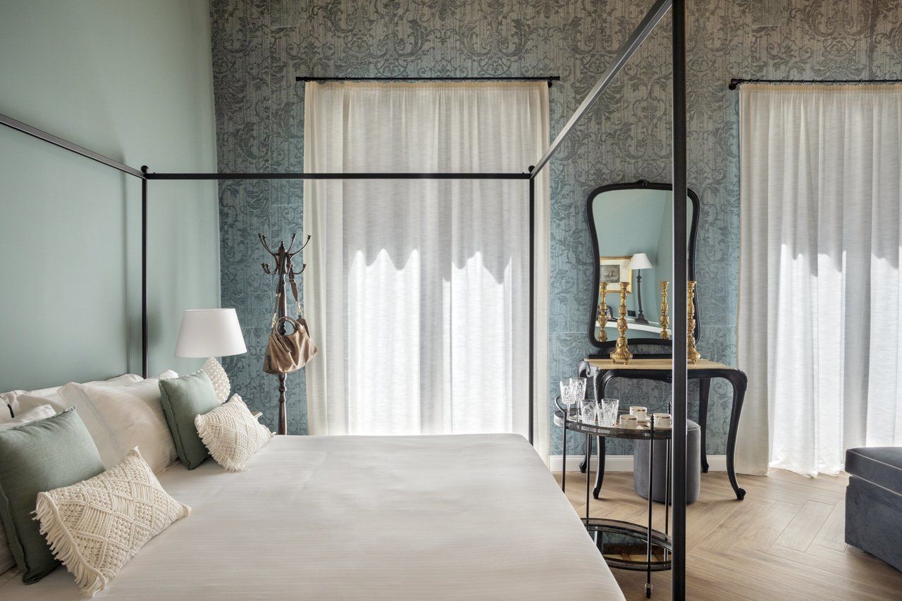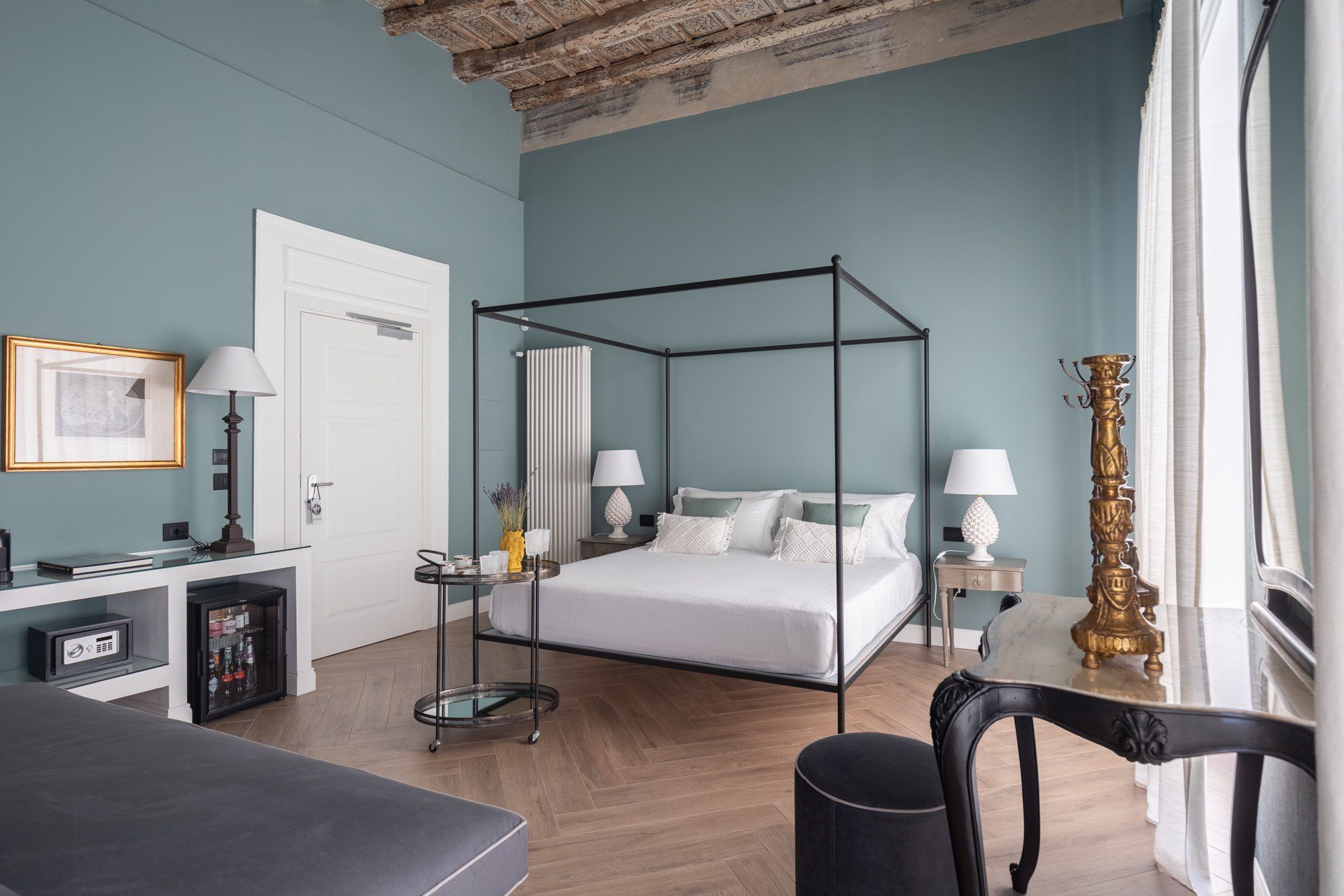 Elegante Suite con soffitto ligneo “a cassettoni”, tipico decoro del 1700, ispirata all’antica usanza secondo la quale alle persone degne di rispetto veniva attribuito l’appellativo “Vossia” proveniente dallo spagnolo “Vuestra Señoria”. La raffinata carta da parati a motivi damascati, la cappelliera di cartone e i candelabri d’epoca evocano una dimensione d’altri tempi. L’Ospite che soggiorna in questa Suite diviene protagonista di un’autentica esperienza di valore.