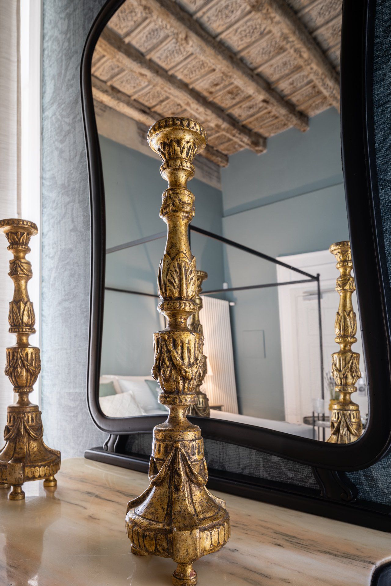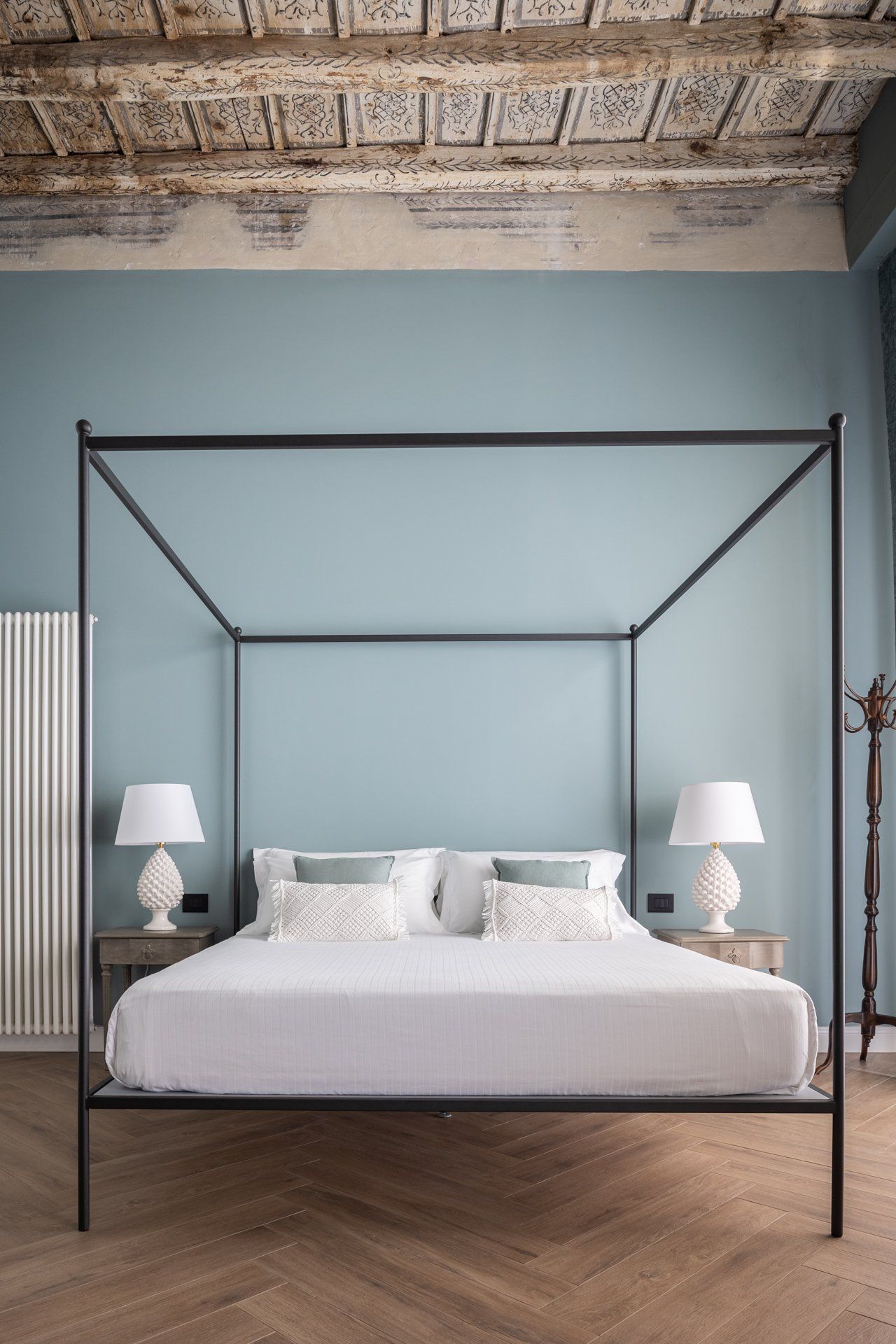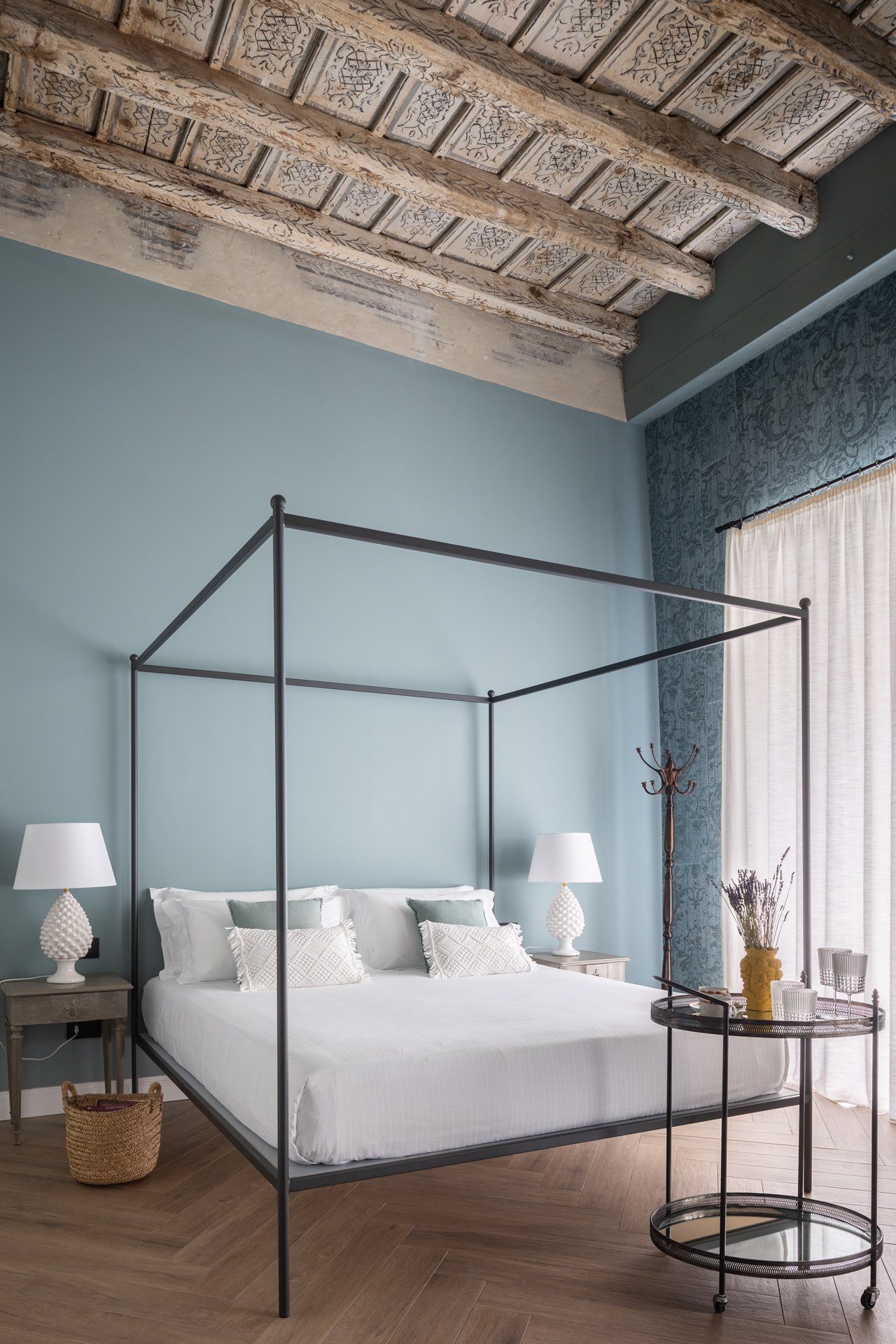 Elegante Suite con soffitto ligneo “a cassettoni”, tipico decoro del 1700, ispirata all’antica usanza secondo la quale alle persone degne di rispetto veniva attribuito l’appellativo “Vossia” proveniente dallo spagnolo “Vuestra Señoria”. La raffinata carta da parati a motivi damascati, la cappelliera di cartone e i candelabri d’epoca evocano una dimensione d’altri tempi. L’Ospite che soggiorna in questa Suite diviene protagonista di un’autentica esperienza di valore.